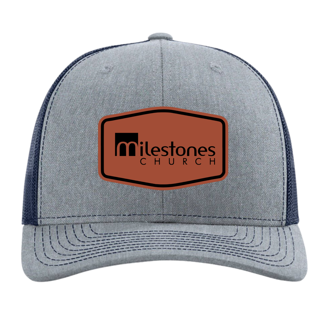 Milestones Church Engraved Leather Patch Sewn On Richardson 112 Hat